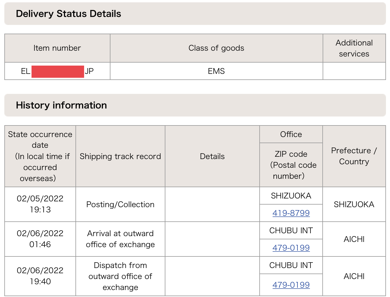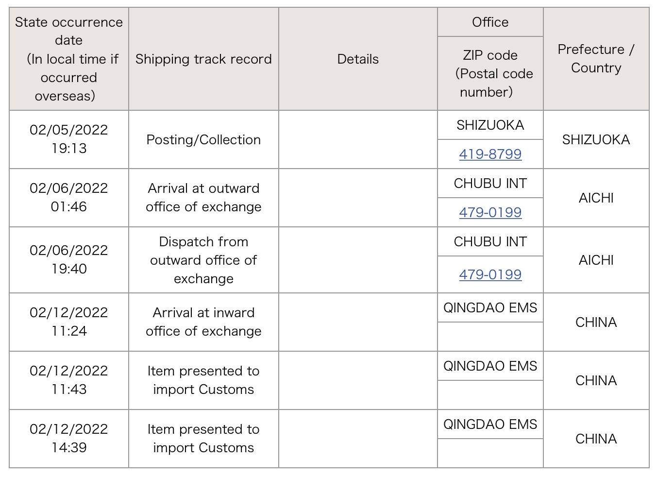 2月11日,仍然在爱知县的出口邮件互换局已发出状态。