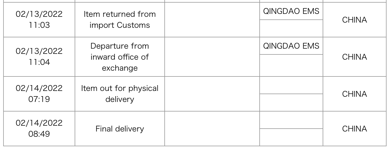 2月13日,从青岛海关放行,离开进出口邮件互换局。