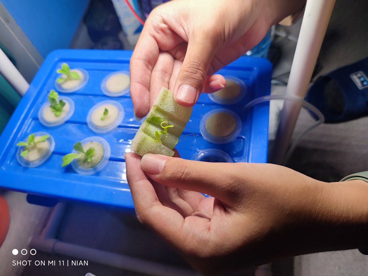 又一周后,一半左右的苗顺利冒出海绵,但是另一半的苗被卡在海绵中。。。